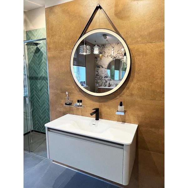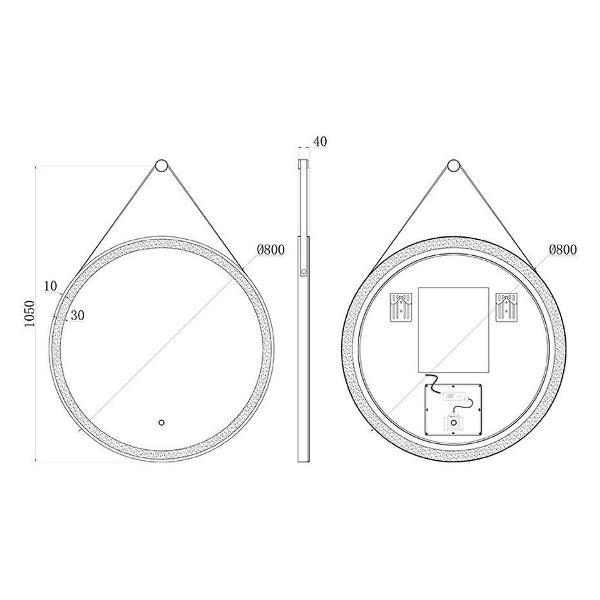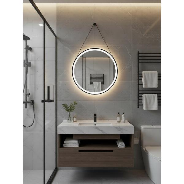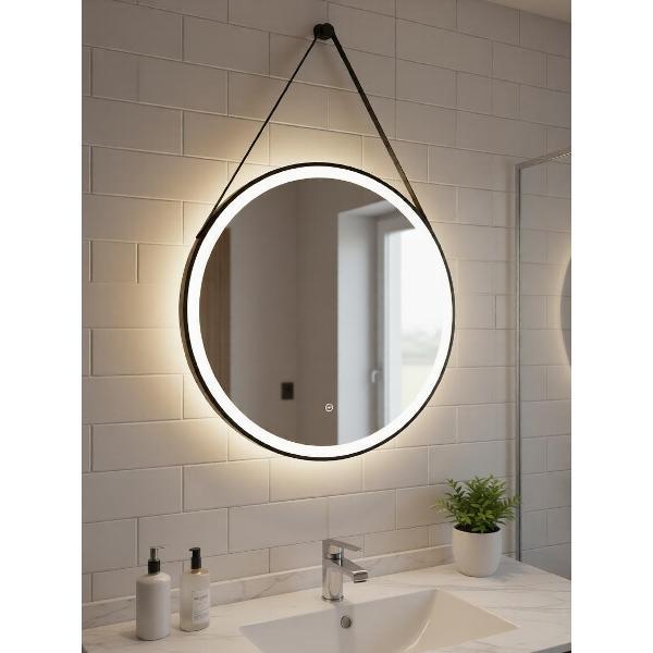 Круглое зеркало диаметром 80 см в металлической раме - компактное и функциональное решение для ванной комнаты, прихожей или гардеробной. Почему стоит выбрать это зеркало? Гибкое освещение: сенсорная система позволяет выбрать оптимальную цветовую температуру светодиодной подсветки: 2700K - тёплый свет для расслабляющей атмосферы; 4000K - нейтральный свет, близкий к дневному; 6400K - холодный свет для максимальной чёткости деталей. Защита от запотевания - зеркало остаётся прозрачным даже после горячего душа. Удобное управление: сенсорный выключатель обеспечивает быстрый и комфортный доступ к настройкам. Компактность и стиль: диаметр 80 см позволяет разместить зеркало даже в небольшом пространстве, а металлическая рама придаёт современный вид и устойчива к влаге и коррозии. Надёжное крепление: зеркало фиксируется на стене с помощью прочного ремня - эстетично и надёжно. Безопасность и качество: электрические компоненты соответствуют стандарту CE.