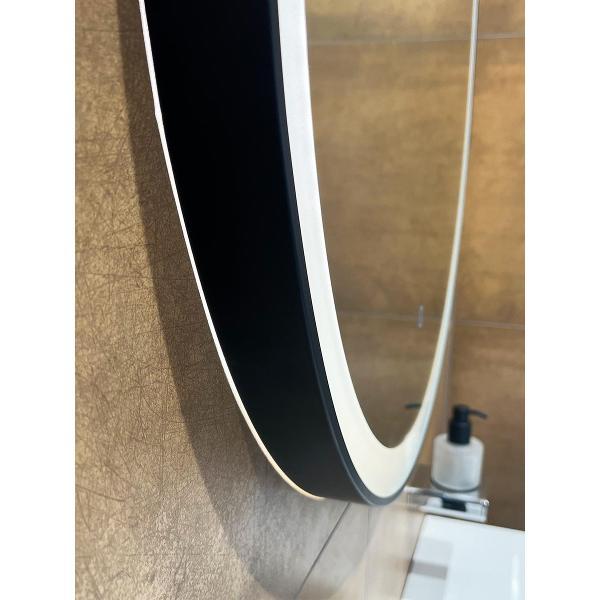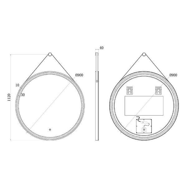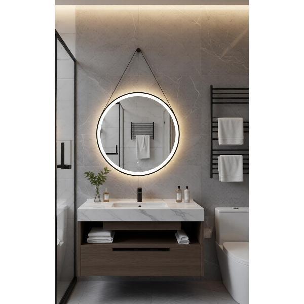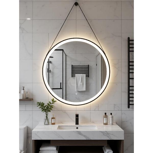 Круглое зеркало диаметром 90 см в металлической раме - компактное и функциональное решение для ванной комнаты, прихожей или гардеробной. Почему стоит выбрать это зеркало? Гибкое освещение: сенсорная система позволяет выбрать оптимальную цветовую температуру светодиодной подсветки: 2700K - тёплый свет для расслабляющей атмосферы; 4000K - нейтральный свет, близкий к дневному; 6400K - холодный свет для максимальной чёткости деталей. Защита от запотевания - зеркало остаётся прозрачным даже после горячего душа. Удобное управление: сенсорный выключатель обеспечивает быстрый и комфортный доступ к настройкам. Компактность и стиль: диаметр 90 см позволяет разместить зеркало даже в небольшом пространстве, а металлическая рама придаёт современный вид и устойчива к влаге и коррозии. Надёжное крепление: зеркало фиксируется на стене с помощью прочного ремня - эстетично и надёжно. Безопасность и качество: электрические компоненты соответствуют стандарту CE.