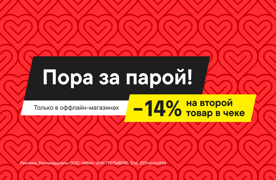 Разве перед Днём всех влюблённых только люди ищут себе пару? Товары тоже хотят провести 14 февраля вместе. Именно поэтому у нас акция: -14% на второй товар в чеке. Но только если покупаешь в розничных магазинах.