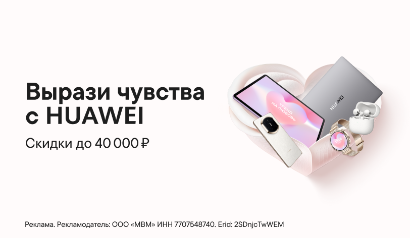 Подарок, который подойдет и для него, и для неё. Смартфоны, планшеты и ноутбуки HUAWEI — стильные, лёгкие, но мощные устройства для каждого. Воспользуйся выгодой до 40 000 ₽ на ноутбуки HUAWEI до 9 марта.