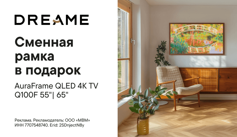 Выбор нового телевизора? Сделай его в пользу Dreame AuraFrame QLED 4K TV Q100F. Отличные современные модели с диагоналями 55 и 65 дюймов и дополнительной рамкой в подарок. Просто загляденье!