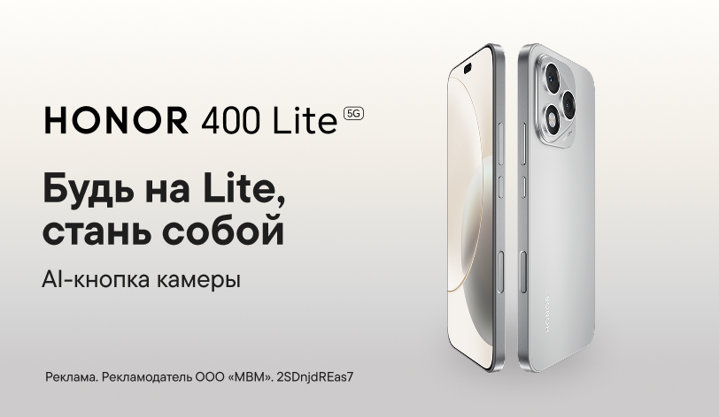 Прикоснись к искусству. Встречай новинку — смартфон HONOR 400 Lite. AI-кнопка камеры. Основной сенсор 108 Мп. Процессор Dimensity 7025 Ultra. Ёмкость батареи 5 230 мА*ч.
