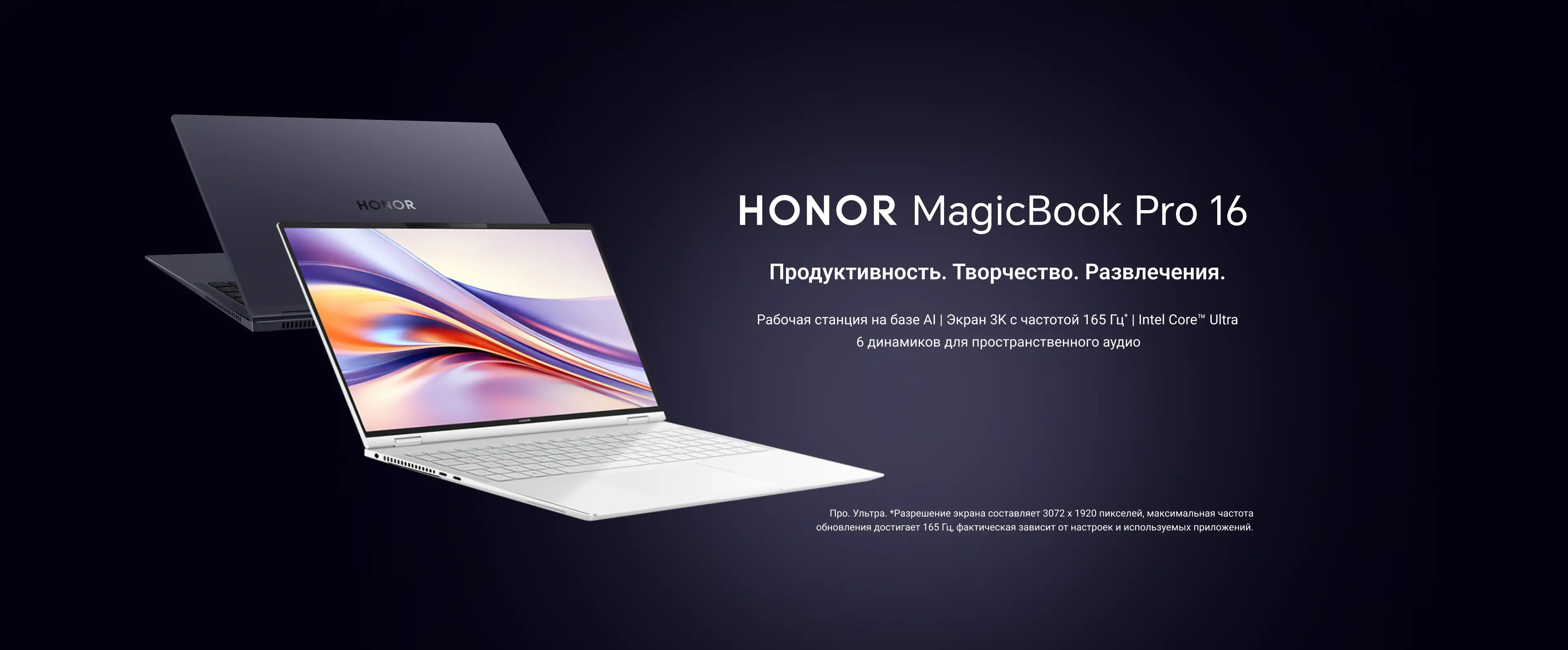 Старт продаж ноутбуков HONOR MagicBook Pro 16! Рабочая станция на базе AI с процессором Intel Core Ultra. Экран 3К с частотой 165 Гц. 6 динамиков для пространственного аудио.Приобретай ноутбук HONOR MagicBook Pro 16 и получай колонку в подарок уже сегодня.