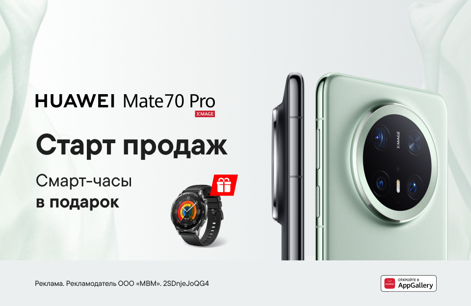 Всё самое лучшее в одном смартфоне – HUAWEI Mate 70 Pro. От инновационных технологий до искусственного интеллекта. Получи возможность запечатлеть самые яркие кадры с помощью камеры XMAGE – стань автором новых идей и живых фотографий с поддержкой ИИ. Делай покупку уже сейчас и получай смарт-часы HUAWEI GT5 в подарок!