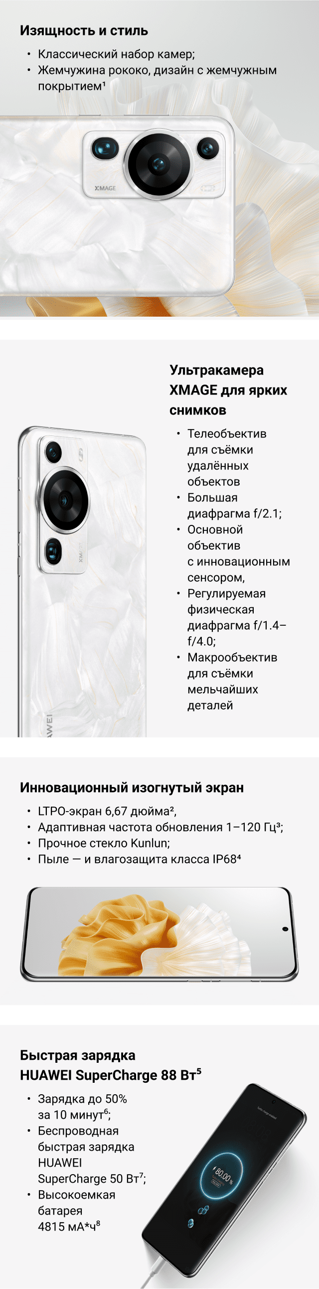 - 66 Вт — это максимальная мощность зарядки, которой можно достичь только при использовании специального адаптера питания и кабеля HUAWEI SuperCharge 66 Вт или 88 Вт. Фактические характеристики зарядки могут отличаться.