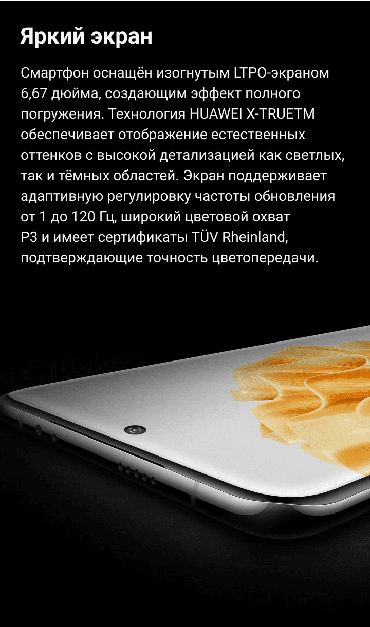 Смартфон оснащён изогнутым LTPO-экраном 6,67 дюйма, создающим эффект полного погружения. Технология экрана HUAWEI X-TRUETM обеспечивает отображение естественных оттенков с высокой детализацией как светлых, так и тёмных областей. Экран поддерживает адаптивную регулировку частоты обновления от 1 до 120 Гц, широкий цветовой охват P3 и имеет сертификаты TÜV Rheinland, подтверждающие точность цветопередачи.