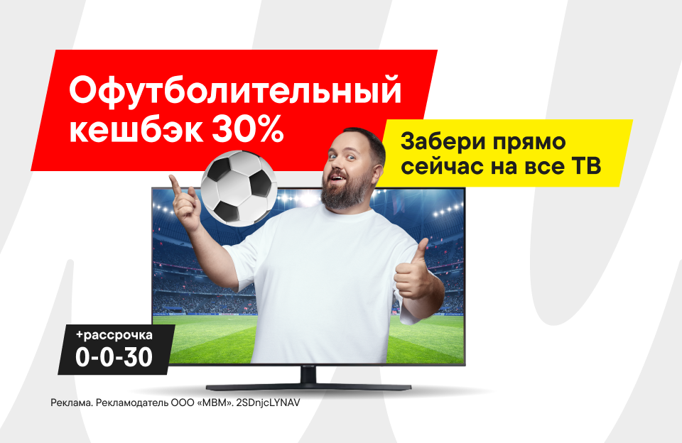 Стань чемпионом выгоды вместе с М.Видео!Выбери и купи телевизор на сайте, в приложении или в магазинах сети и получи кешбэк 30% на карту лояльности.