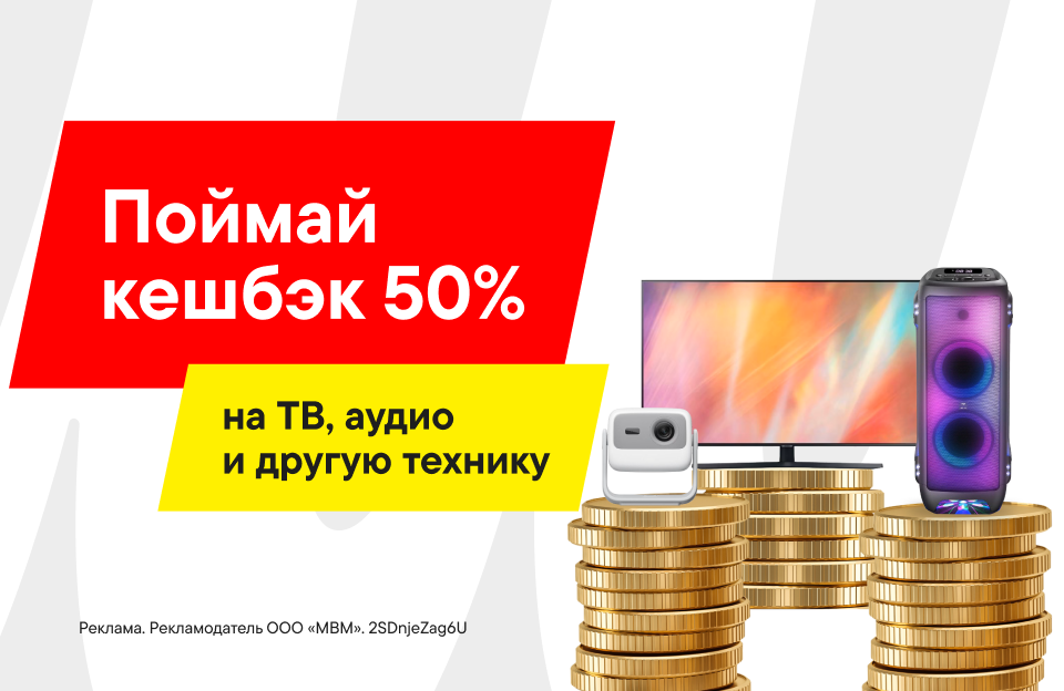 За кешбэком — к нам! Выбери и купи телевизор, саундбар, проектор и другую аудио- или видеотехнику в М.Видео и получи кешбэк 50% бонусами на карту лояльности! Копи бонусы и используй их при оплате новых покупок — на сайте, в приложении и в магазинах сети.