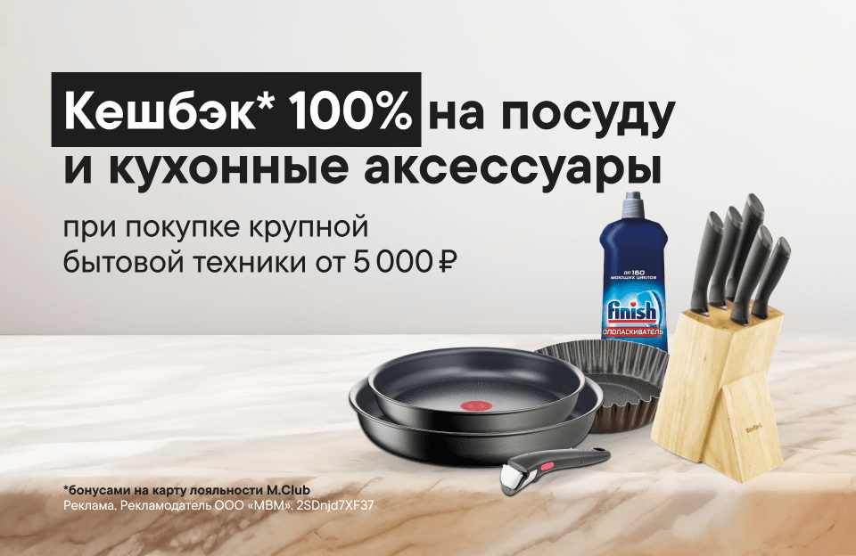 Выбери и купи ТВ, крупную бытовую или климатическую технику от 5000 рублей вместе с посудой и аксессуарами для кухни и получи 100% кешбэк на посуду, бытовую химию и аксессуары бонусами на карту лояльности.