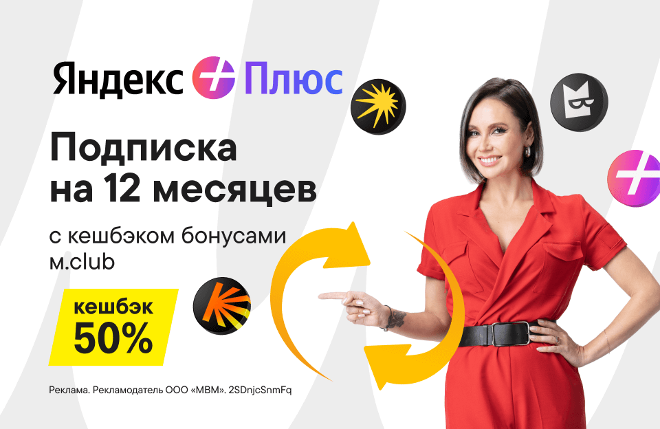 Приготовили подарки! Получи кешбэк 50% на карту лояльности при покупке подпискиЯндекс Плюс на 12 месяцев до 13 января. Яндекс Музыка, кешбэк в сервисах Яндекс, Кинопоиски многое другое для тебя и трёх близких. Выбери выгоду.