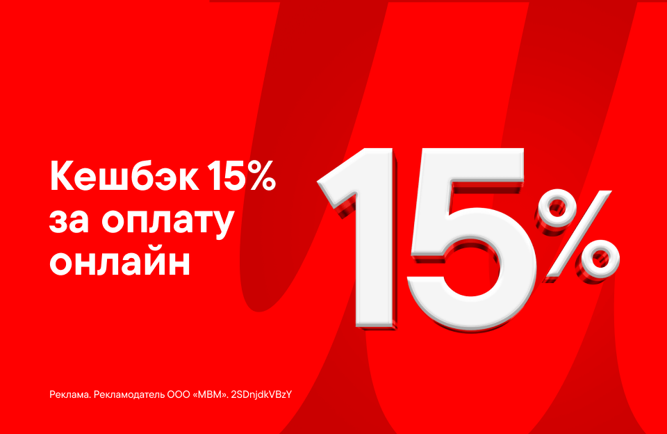 Не пропусти дополнительную выгоду в М.Видео! Просто оплати товары онлайн и получи кешбэк 15% от стоимости заказа бонусами на бонусную карту.
