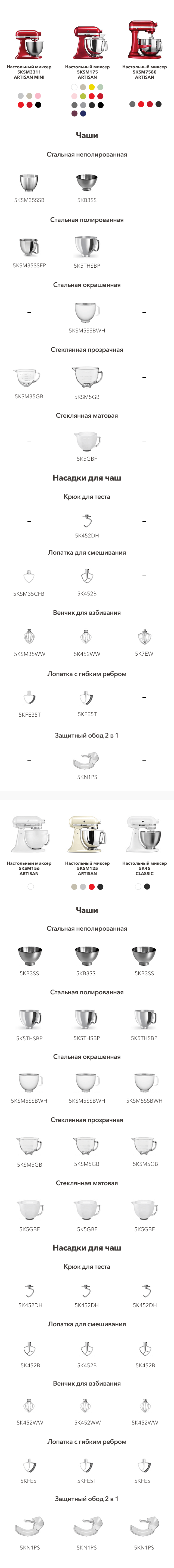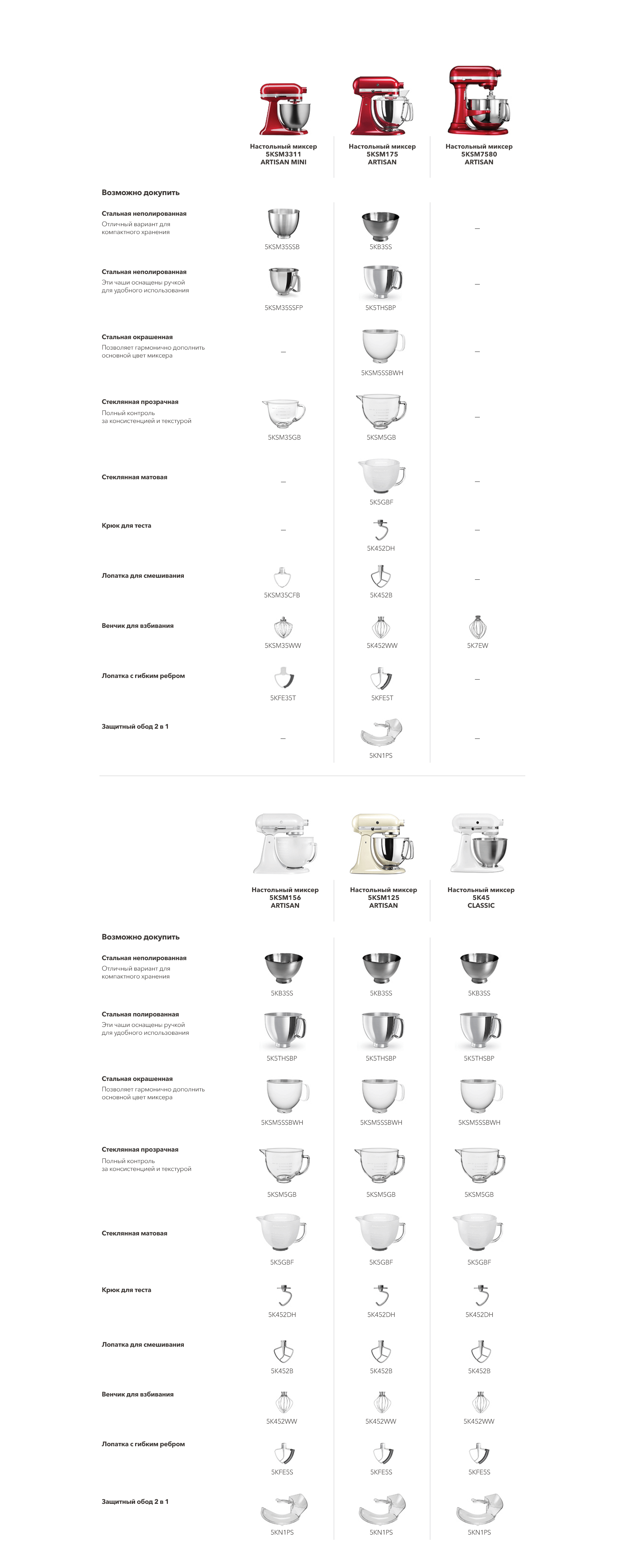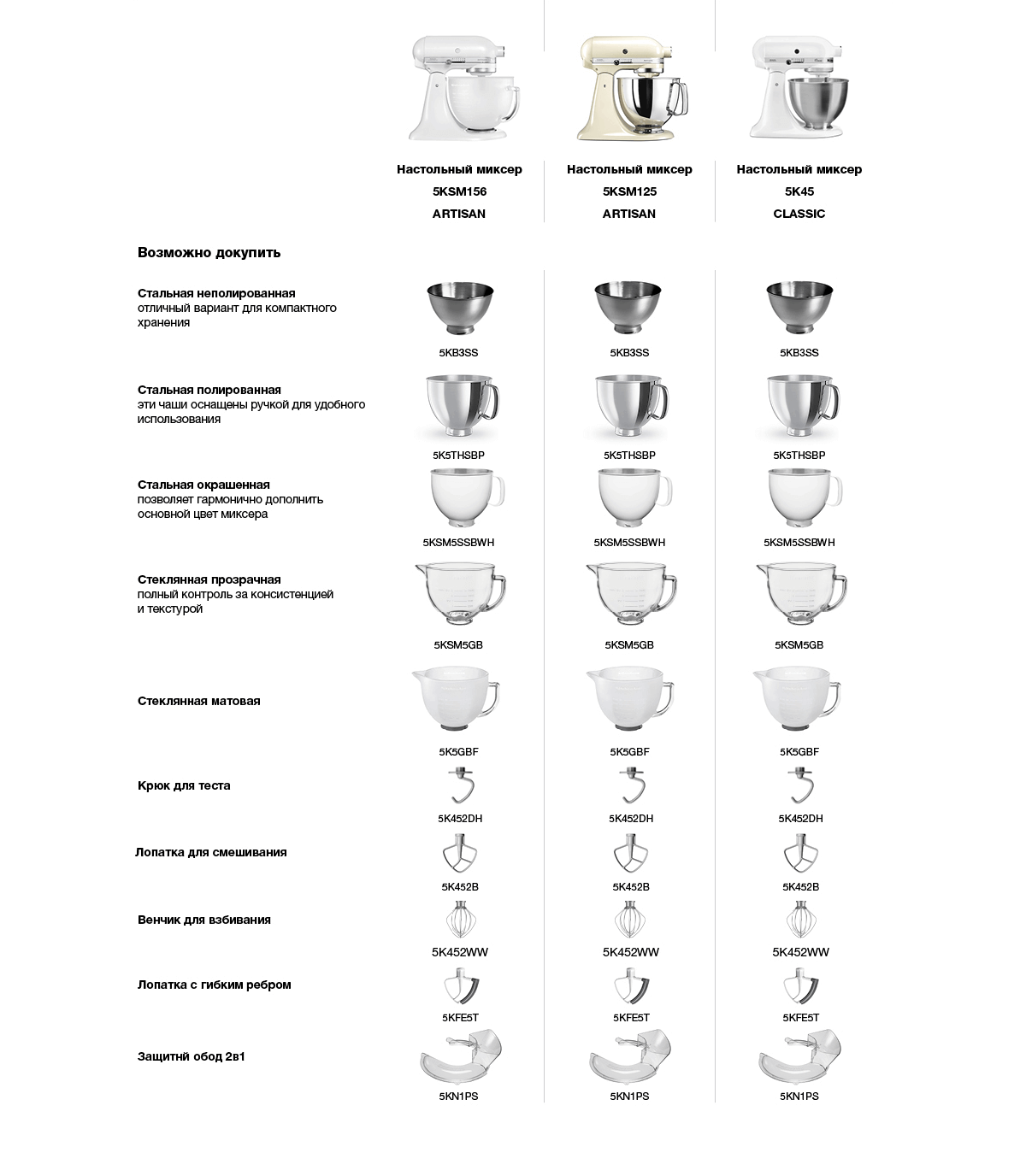Открой для себя необходимые аксессуары для миксера KitchenAid®, которые помогут использовать прибор с максимальной эффективностью. Дополнительные чаши, крюки для теста, лопатки для смешивания, венчики для взбивания и защитные ободы разработаны специально для кухонных машин KitchenAid®.