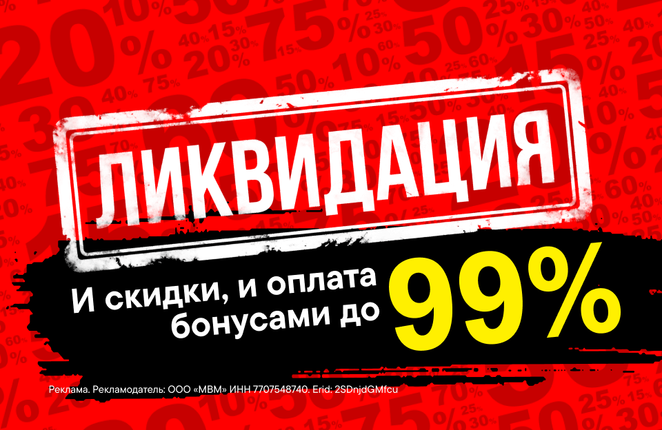 Две девятки рядом — это 99. А скидки до 99% и возможность оплатить бонусами до 99% покупки — это наша Ликвидация. Успей, пока другие всё не разобрали.