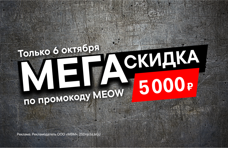 Держи промокод MEOW.Примени его к любой* покупке от 30 000 ₽ – и получишь выгоду 5 000 ₽.