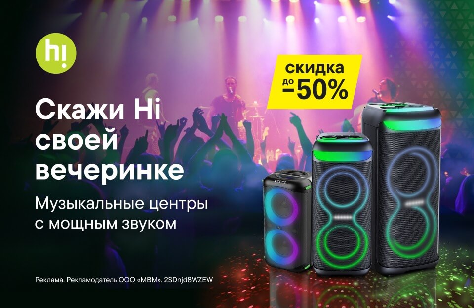 Скажи Hi своей вечеринке!Музыкальные центры с динамической подсветкой ждут тебя эксклюзивно в М.Видео.Устраивай шоу без ограничений.