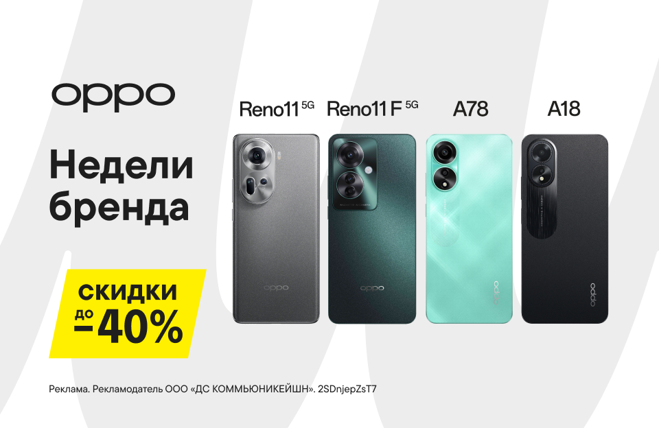 Смартфоны OPPO — яркие элементы современных технологий. Запоминающийся дизайн, мощные батареи и большие экраны. Воспользуйся скидками до 40% на смартфоны OPPO с 7 по 27 мая.