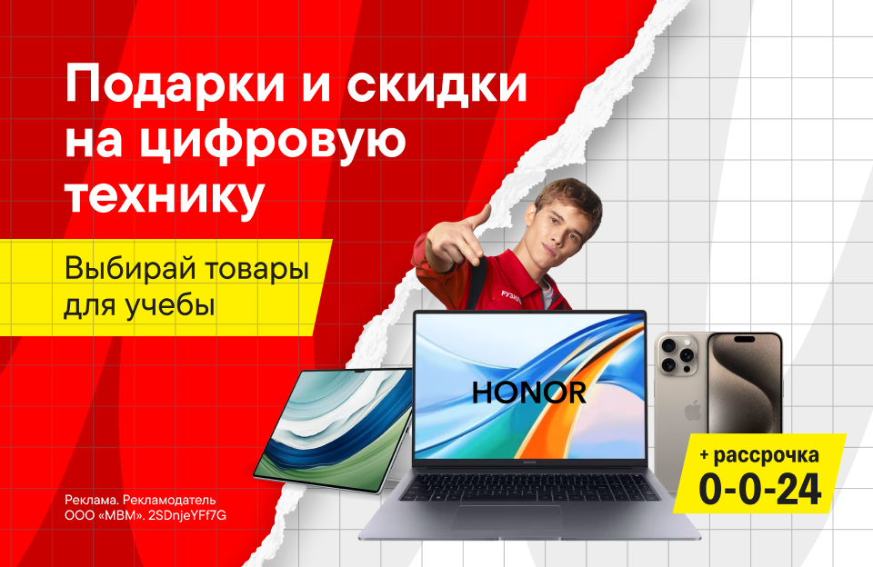 Показываем приятную арифметику: скидки плюс подарки. Остаётся только выбрать! Врывайся в новый учебный год с современной техникой: смартфонами, гаджетами, ноутбуками, планшетами или товарами для гейминга.