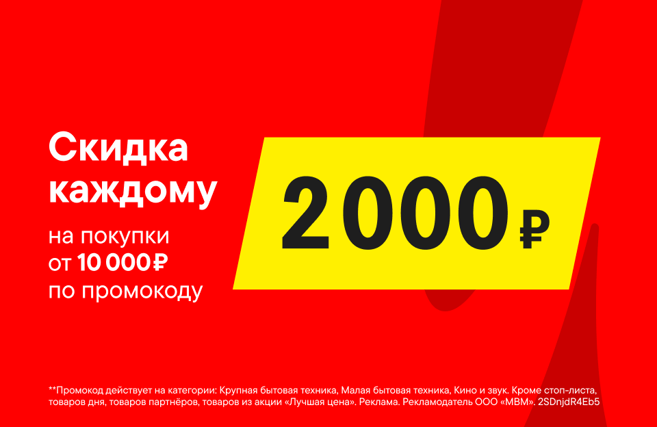 Получи специальный промокод* в СМС, email или на онлайн-площадках. Затем выбери товары из категорий: телевизоры и цифровое ТВ, техника для кухни, дома, красоты и здоровья на сумму от 10 000 ₽ и активируй выгоду 2 000 ₽ до 2 декабря.