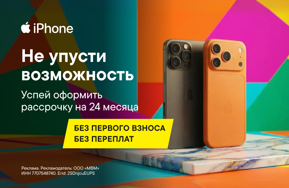Акция «Рассрочка 0-0-24» действует на товары по акции при оформлении кредита с 11.02.2026 г и до особого распоряжения. Покупайте товары/услуги по акции «Рассрочка 0-0-24» на срок до 24 месяцев. Кредит предоставляет АО «ОТП Банк», Москва, ОГРН 1027739176563 (далее – Банк), займ – ООО МФК «ОТП Финанс», Москва, ОГРН 1157746064300 (далее – МФК). В акции участвуют товары и/или услуги из списка организатора акции - ООО «МВМ», 143001, Московская область, г.о. Одинцовский, пгт. Новоивановское, ул. Западная, стр. 180, ОГРН 1057746840095 (далее – «Продавец»). В рамках акции Банк предоставляет покупателю кредит/займ по продукту «М 0-0-24 +Б» на товар и/или услугу Продавца. ООО «МВМ» предоставляет покупателю скидку от цены товара/услуги в размере процентов за пользование кредитом, в результате чего переплаты не возникает, при условии, что дополнительные услуги Банка не приобретаются. Cрок кредита/займа 24 месяца, первоначальный взнос 0% от цены товара и/или услуги. Полная стоимость кредита (годовых): в Банке 13,00% - 33,87% , в МФК 13,00% - 60,67%.* Размеры процентных ставок, продолжительность соответствующих периодов их действия и кол-во таких периодов в каждом конкретном случае определяются Банком/МФК по результатам скоринга. Процентная ставка по кредиту/займу (годовых) составляет: в Банке 13,00% - 33,8%, в МФК 13,00% - 60,5%. Сумма кредита/займа от 3 000 до 300 000 руб. Решение о выдаче кредита принимается Банком/МФК по своему усмотрению. Условия кредита/займа актуальны на дату начала акции и могут быть изменены Банком/МФК/ Организатором Акции по своему усмотрению. Полный текст правил, перечень товаров/ услуг, подробности приобретения товаров/ услуг в кредит в рамках акции уточняйте в магазинах «М.Видео», на сайте www.mvideo.ru, также по телефону 8 800 600-777-5.
