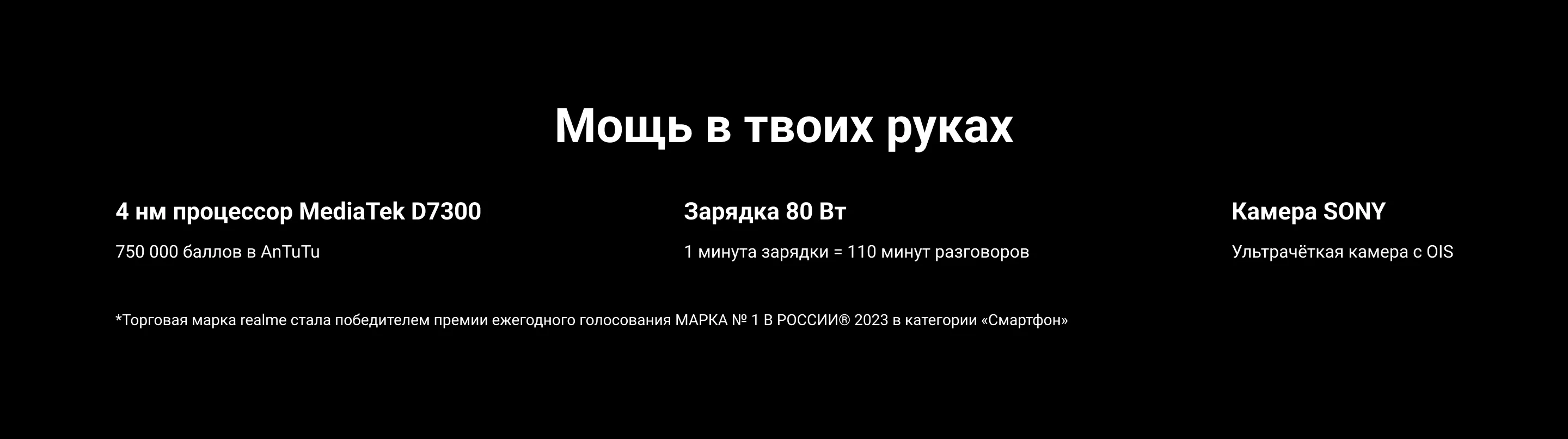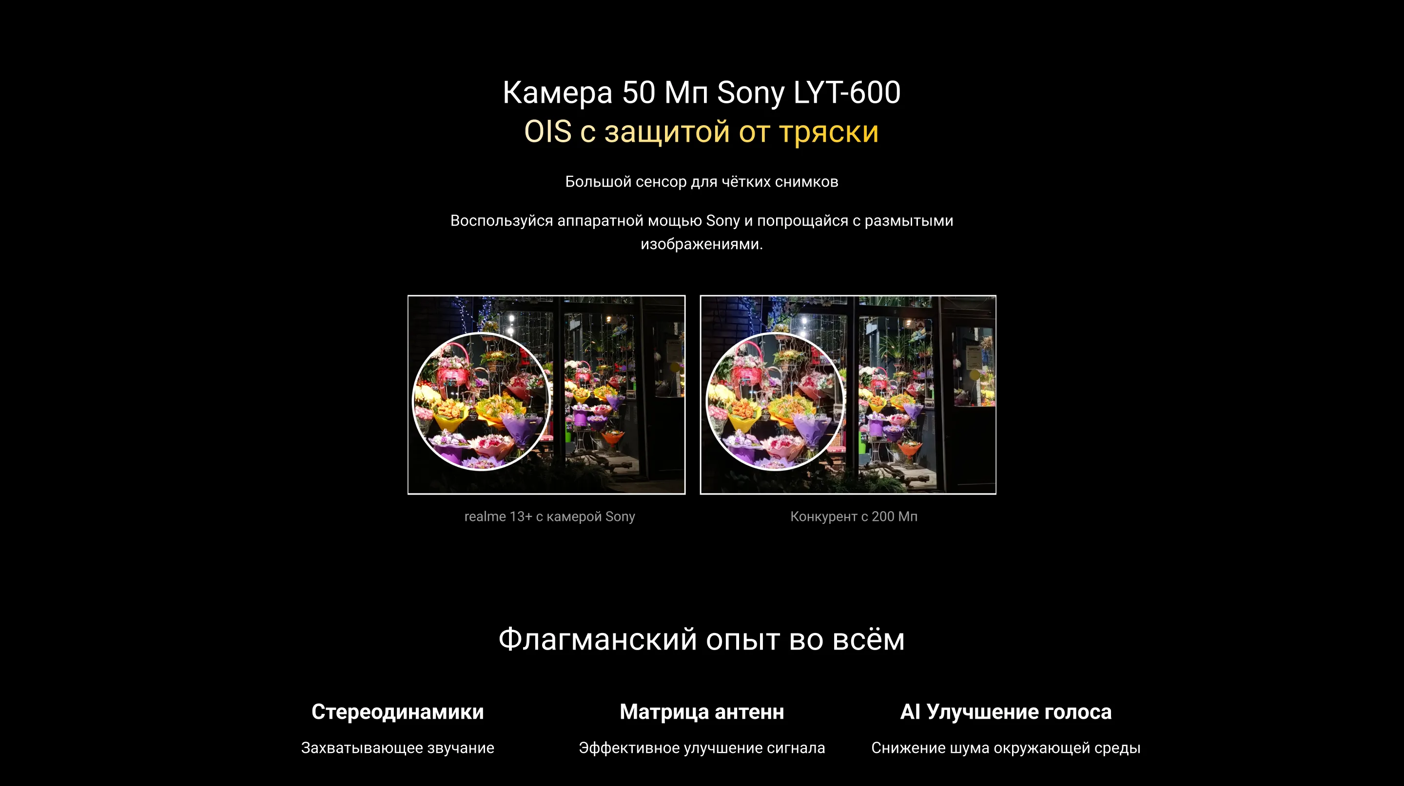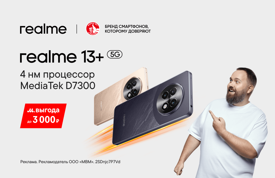 Почувствуй мощь в твоих руках. Новинки от бренда realme — смартфоны 13+ 5G и 13 5G — ждут тебя. Процессор MediaTek D7300. Быстрая зарядка 80 Вт. Ультрачёткая камера Sony с OIS. Выбери одну из новинок серии realme 13 уже сегодня.