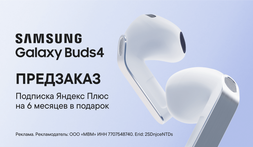 Новое поколение наушников Samsung Galaxy Buds 4 уже совсем близко. Так близко, что даже доступен предзаказ. А при оформлении ты получишь подарок: Подписка Яндекс Плюс на 6 месяцев. Будет за чем скоротать время, пока не приедут твои новенькие Galaxy Buds 4.