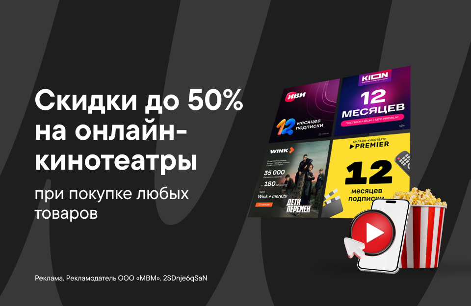 Подписка на онлайн-кинотеатр за половину цены! Не пропусти скидку 50% при покупке любых товаров. Приятного шопинга и просмотра любимых фильмов, сериалов или шоу.