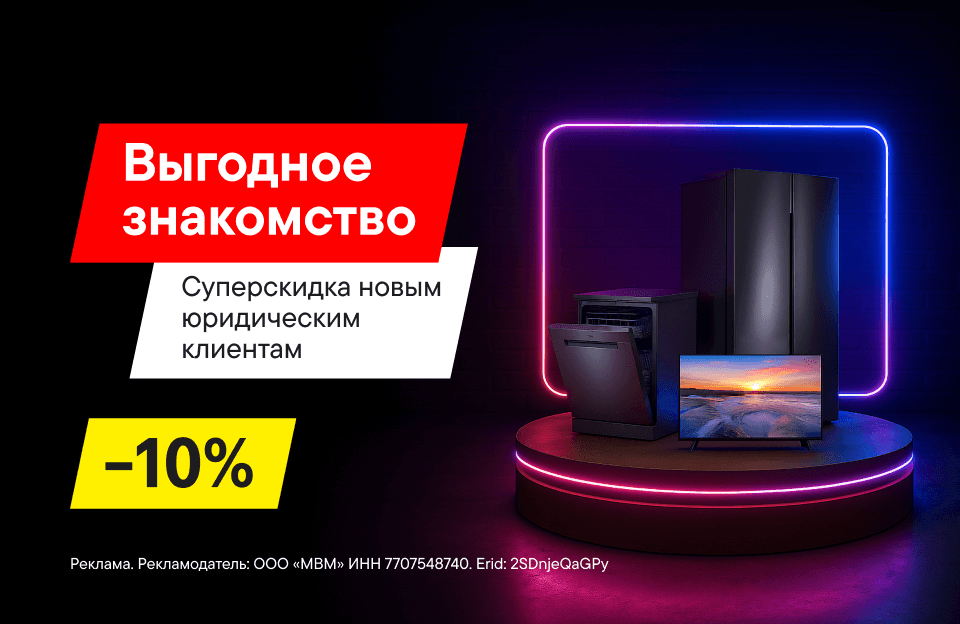 Мы всегда рады новым знакомствам! А чтобы эта радость была взаимной, мы дарим нашим новым клиентам — юридическим лицам — приветственную скидку в размере 10% на мелкую бытовую технику и телевизоры.Ну как, приятно познакомиться?Для получения скидки обращайтесь по телефону 8 (800) 600-77-75 или отправьте заказ на corporate@mvideo.ru