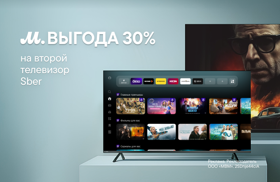Пришёл за одним телевизором? Забирай второй с выгодой 30%.Sber — захватывающая чёткость, любимые сервисы и яркое изображение. Наслаждайся скидкой 30% на второй телевизор Sber при единовременной покупке до 6 октября.