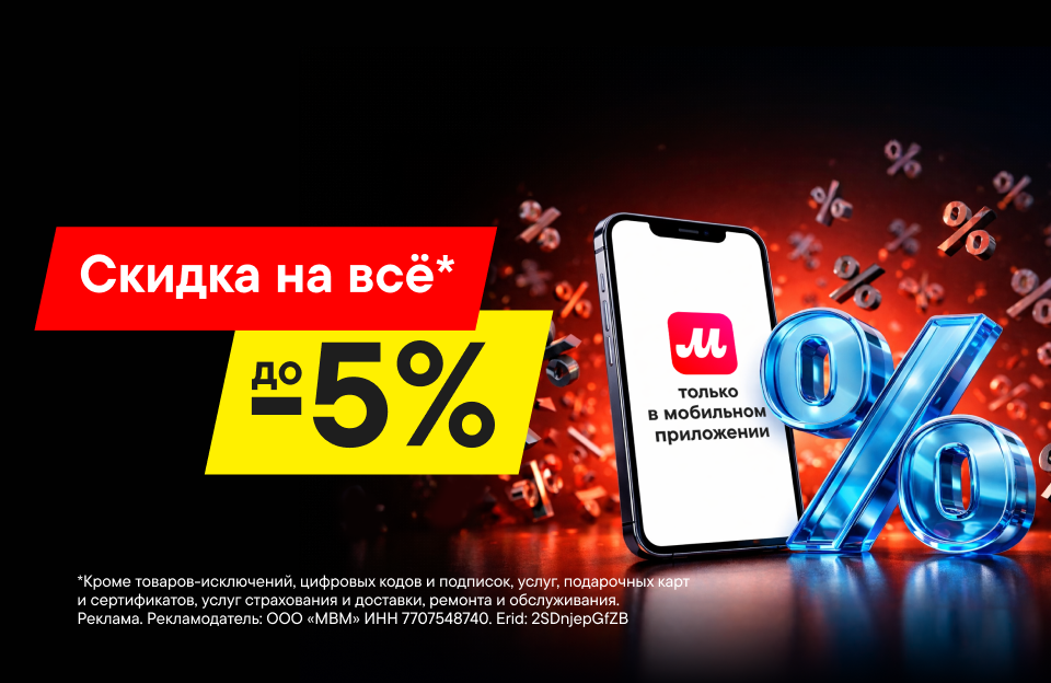 Только в мобильном приложении М.Видео! Получи скидку до 5% по промокоду и дополнительно примени бонусы на любую технику, кроме товаров-исключений. Введи промокод* MOBILE в специальное поле при оформлении заказа.