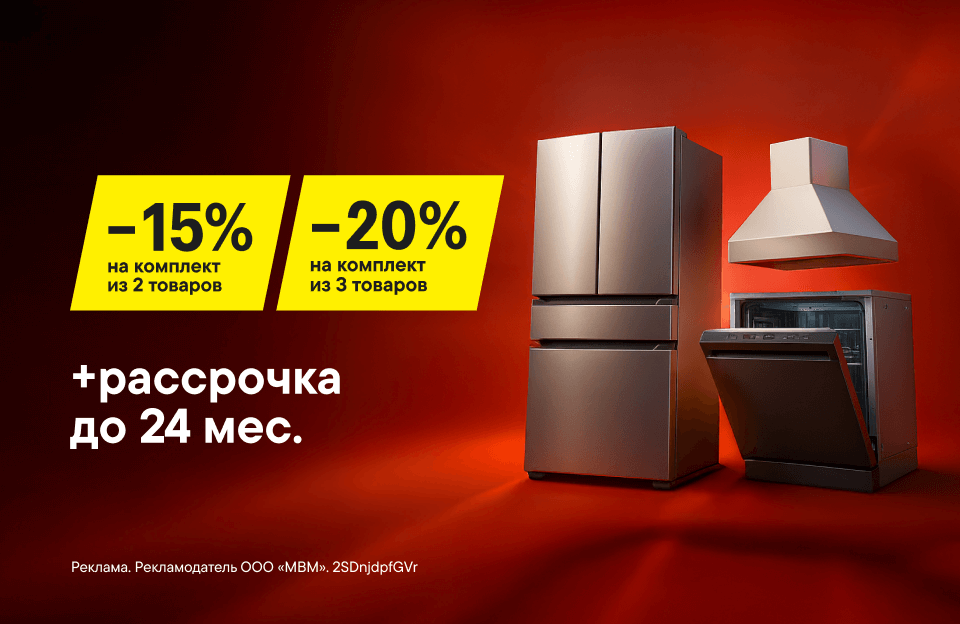 Покупаешь бытовую технику – покупай с размахом: выгоде это понравится.Купи комплект из двух единиц крупной бытовой техники, и скидка составит -15%,добавь ещё единицу – и скидка будет уже -20%.