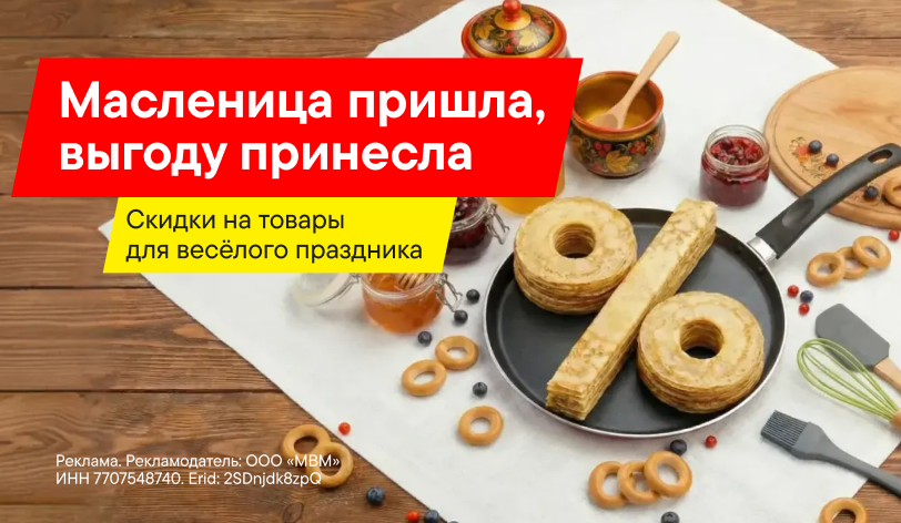 В этом году Масленица придёт не только с весной и радостью, но и с выгодой. Только посмотри, какие румяные скидки на товары для этого весёлого праздника.Спеши купить, чтобы широко отметить!