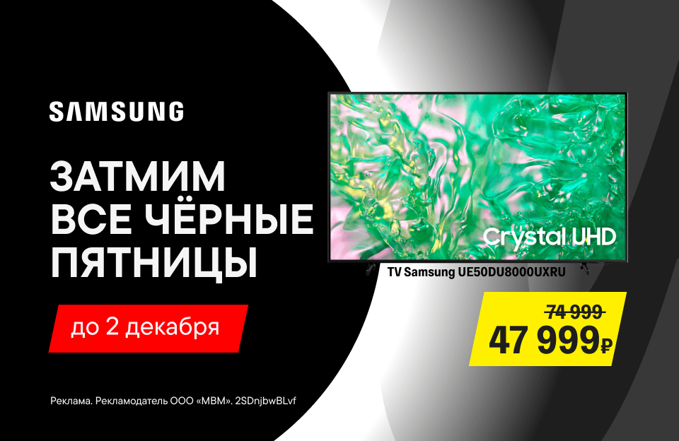 Магия настоящего кино начнётся в Чёрную Пятницу. Телевизоры Samsung — реалистичная картинка с яркой и точной цветопередачей твоих любимых фильмов, шоу и сериалов. Приобрети новый ТВ с выгодой во время знаменитой распродажи с 15 ноября по 2 декабря.
