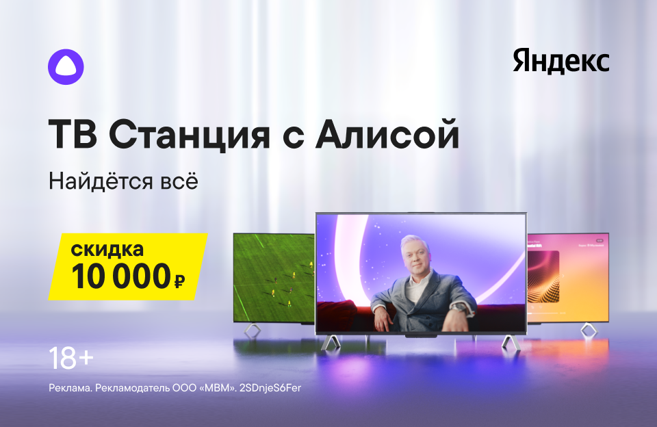 Найдётся всё. Фильмы, сериалы, блоги, музыка. Виртуальный ассистент Алиса с голосовым управлением без пульта. Завораживающее изображение. Забери Яндекс ТВ Станцию с Алисой с выгодой 10 000 рублей до 9 сентября.