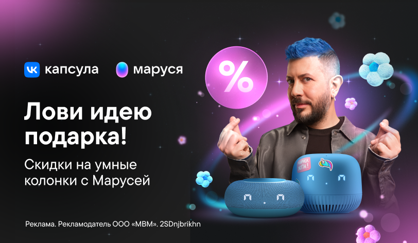 Лови идею подарка! VK Капсула с дружелюбной Марусей — умная колонка для твоих любимых. Включит музыку, напомнит о делах, расскажет о погоде или поиграет с детьми. Поймай скидки на умные колонки VK Капсула до 10 марта.
