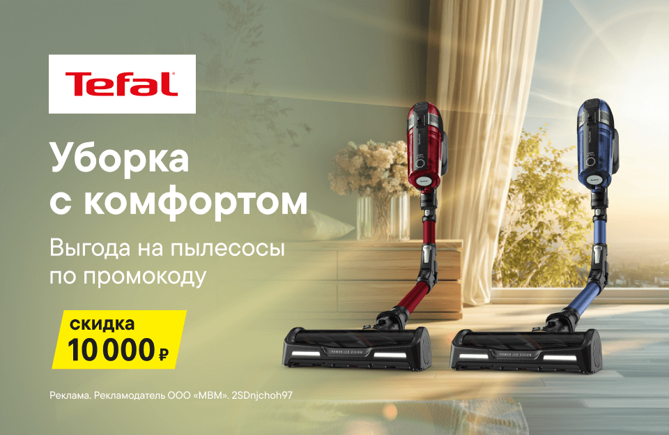 Взять всё в свои руки и быстро закончить уборку? Прекрасный план, да ещё и выгодный. Скидка 10 000 ₽ по промокоду TEFAL10000 на пылесосы Tefal ждёт тебя до 30 июня. Упрости домашние дела с техникой Tefal.
