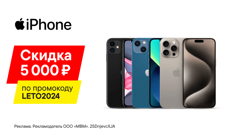 Смартфоны Apple iPhone на любой вкус со скидкой 5000 ₽ по промокоду LETO2024. Успей купить выгодно!Акция доступна и для юридических лиц. По вопросам скидок: 8 (800) 600 77 75 или corporate@mvideo.ru