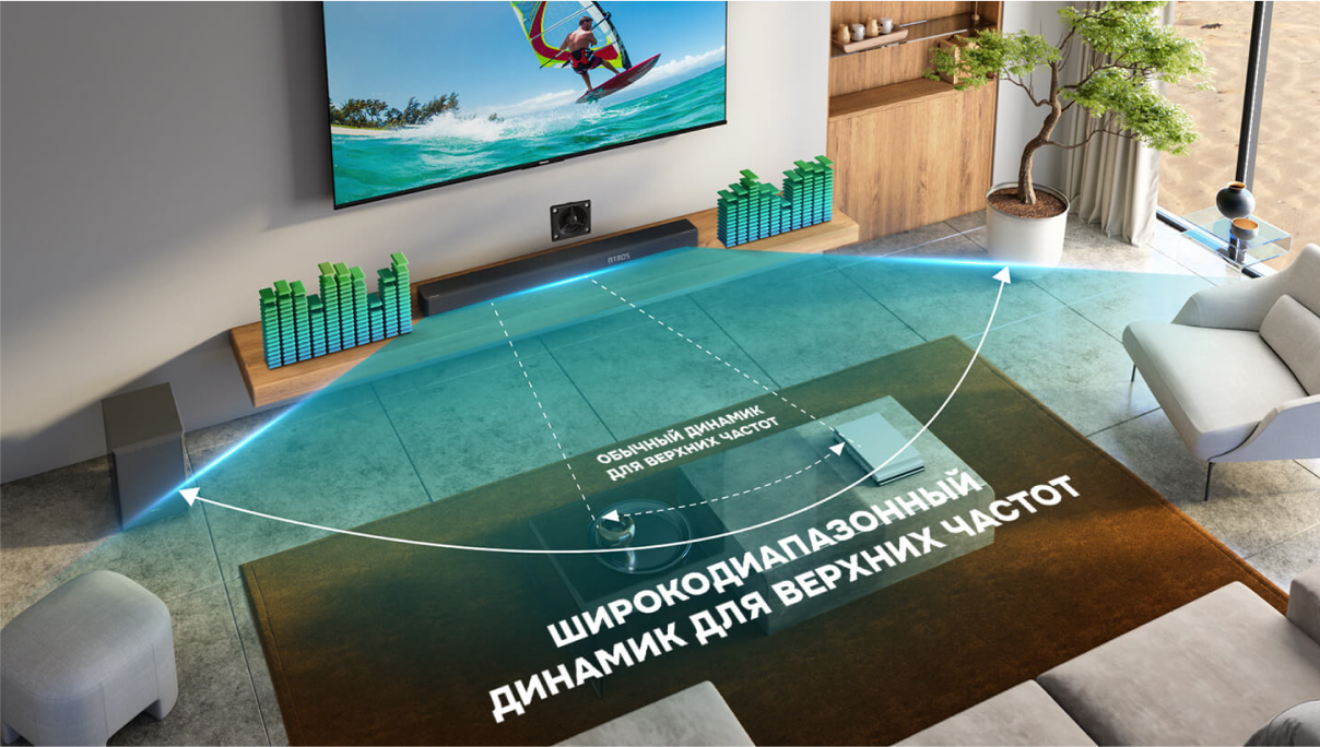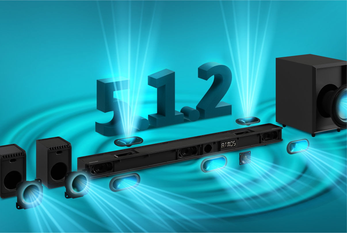 9 динамиков обеспечивают потрясающую максимальную мощность (420 Вт) отражающегося от стен звука с эффектом погружения.