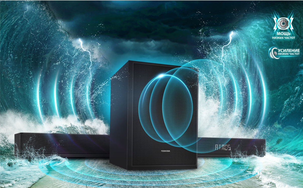 Один пульт дистанционного управления — двойное удовольствие. Используй всего лишь один удобный, понятный и наглядный пульт ДУ для настройки параметров звуковой панели с телевизора Toshiba.