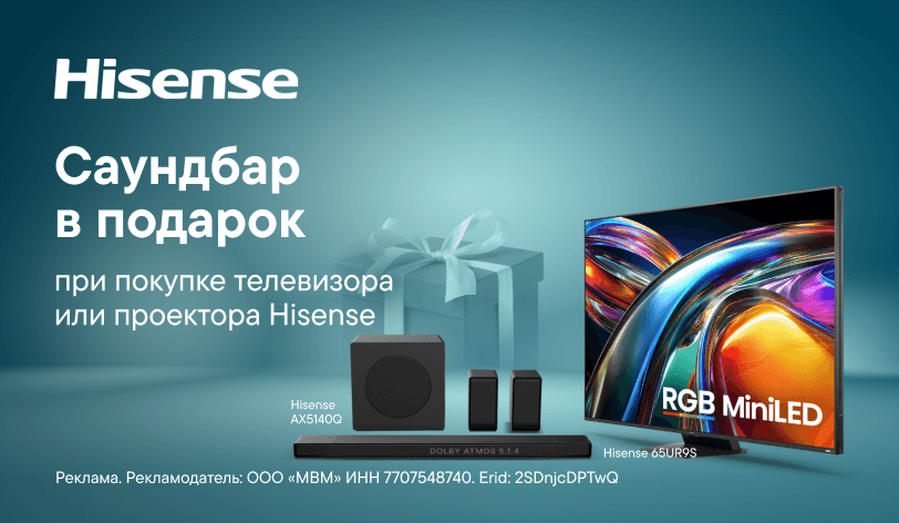 И телевизоры, и проекторы Hisense радуют качеством и надёжностью сами по себе. Но нам этого мало — мы решили дать тебе ещё одну причину купить: премиальный саундбар с технологией Dolby Atmos 5.1.4. Просто купи телевизор или проектор из списка — и саундбар станет твоим подарком.