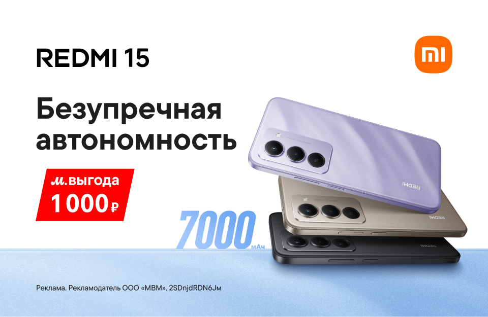 Смартфон Redmi 15 от Xiaomi — автономность на целые дни. Ёмкая батарея на 7 000 мА*ч и поддержка быстрой зарядки 33 Вт. Иммерсивный FHD+ дисплей с частотой обновления до 144 Гц. Не пропусти выгоду на Redmi 15.