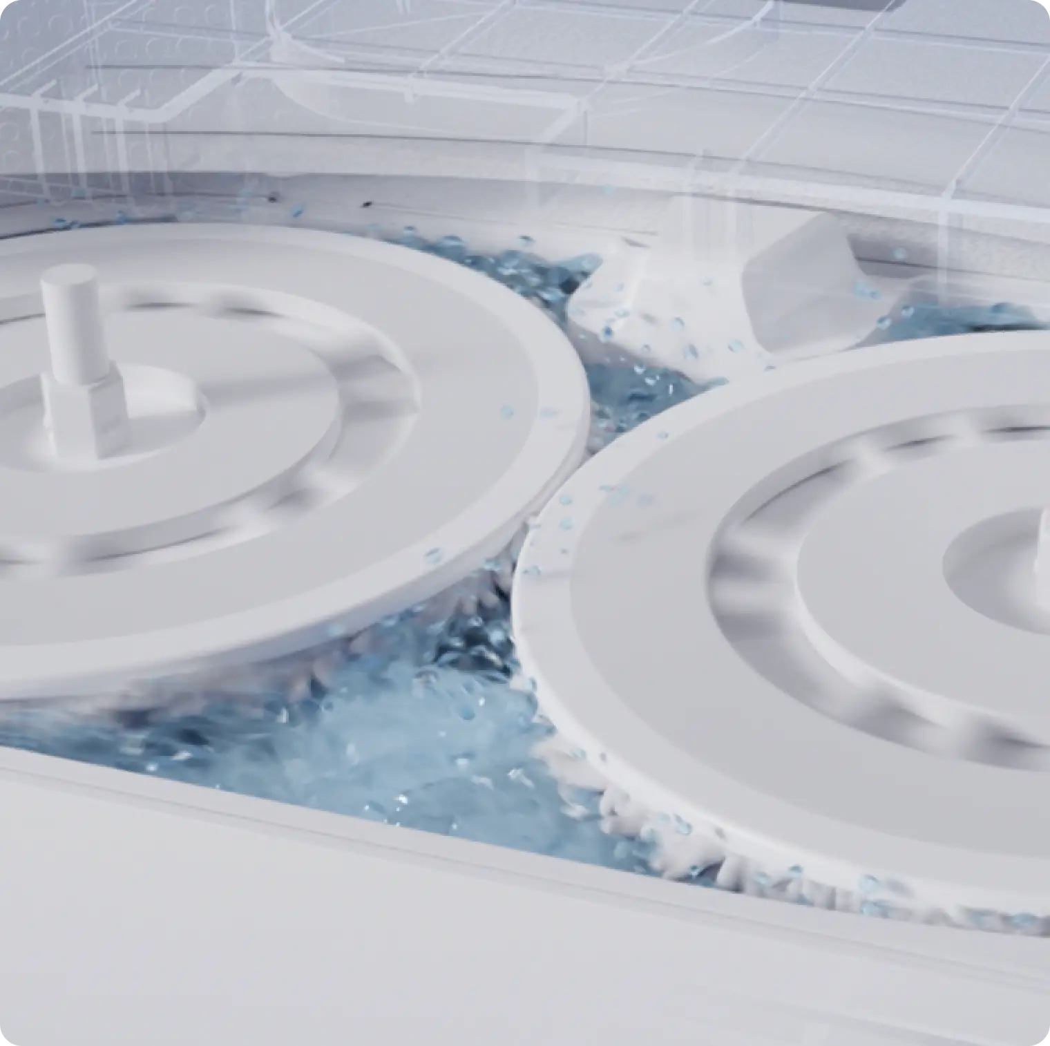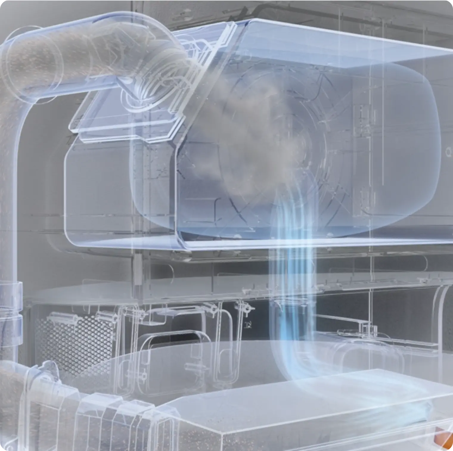 После уборки валики очищаются мощными струями воды от остатков грязи и пыли. После очистки поток холодного воздуха автоматически сушит валики, что предотвращает появление плесени и затхлых запахов, вызванных влажностью.
