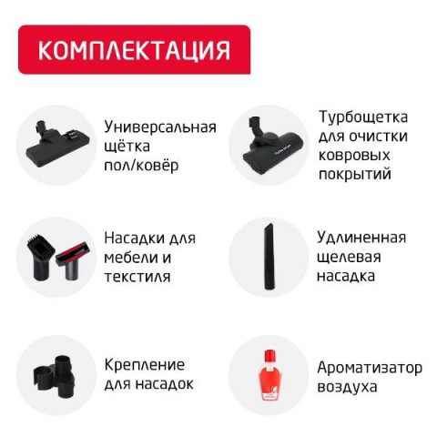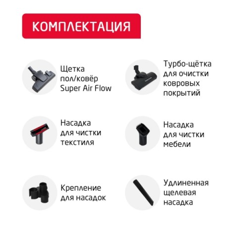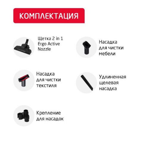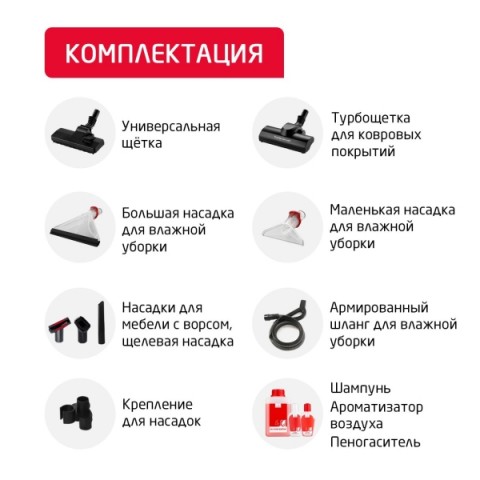 • Насадки:для мягкой мебели, для паркета, для пола и ковров, минитурбощетка, турбощеткa, щелевая, насадка щетка