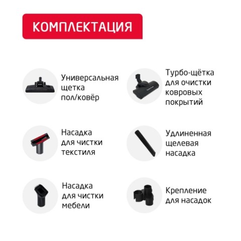 • Насадки:для паркета, для пола и ковров, турбощеткa, щелевая, насадка щетка