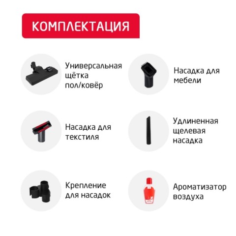 • Насадки:для мягкой мебели, для паркета, для пола и ковров, щелевая, насадка щетка