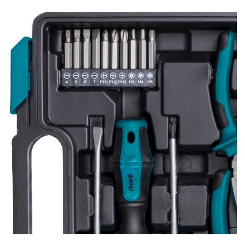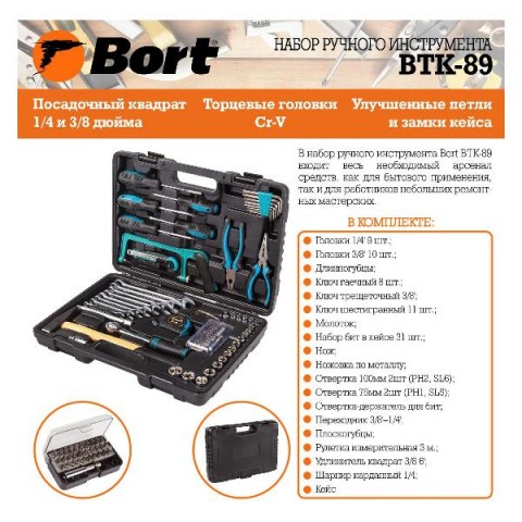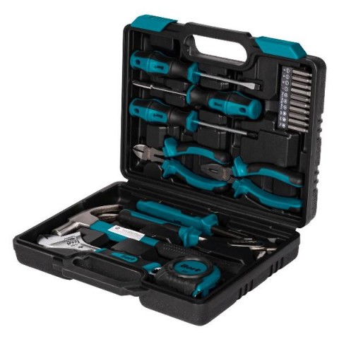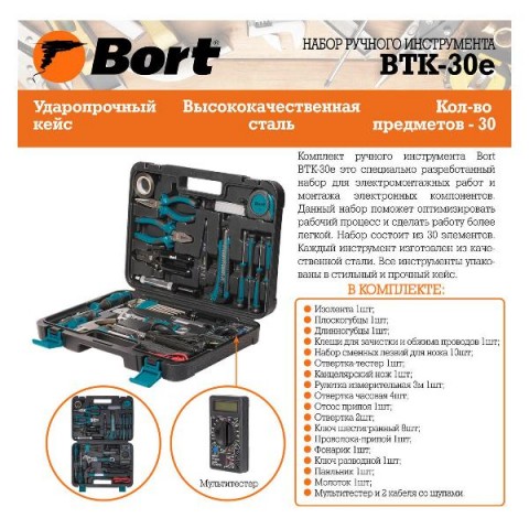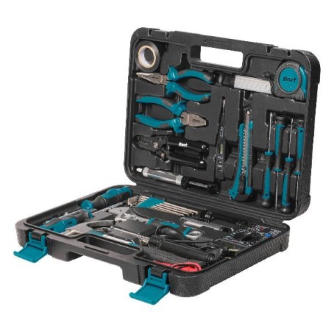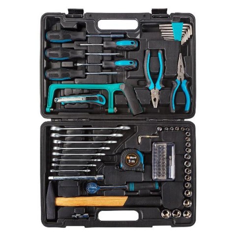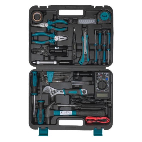 • Комплектация:Изолента (1 шт); Плоскогубцы (1 шт); Длинногубцы 160 мм (1 шт); Приспособление для зачистки проводов (1 шт); Набор сменных лезвий для ножа (10шт) (1 шт), Отвертка-тестер (1 шт); Канцелярский нож (1 шт); Рулетка измерительная 3 м (1 шт); Отвертка часовая (4 шт); Отсос припоя (1 шт); Отвертка (2 шт); Ключ шестигранный (8 шт); Проволока-припой (1 шт), Фонарик (1 шт); Ключ разводной (1 шт); Паяльник (1 шт); Молоток (1 шт); Мультитестер (1 шт); Кабель со щупом (2 шт); Кейс (1 шт)