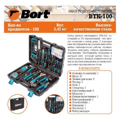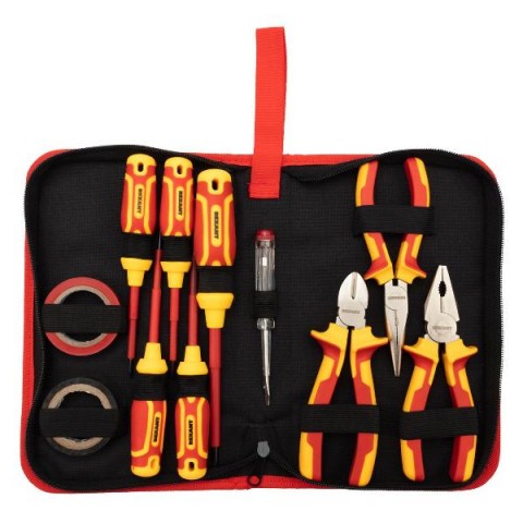 • Комплектация:2 шлицевые отвертки: SL 3x100 и SL 5,5x125 мм; 3 крестовые отвертки: PH 0x60, PH 1x80 и PH 2x100 мм; отвертка-индикатор; пассатижи; бокорезы (кусачки); длинногубцы, 2 изоленты ПВХ
