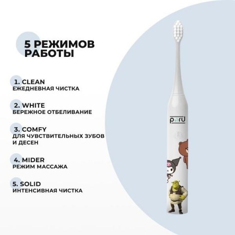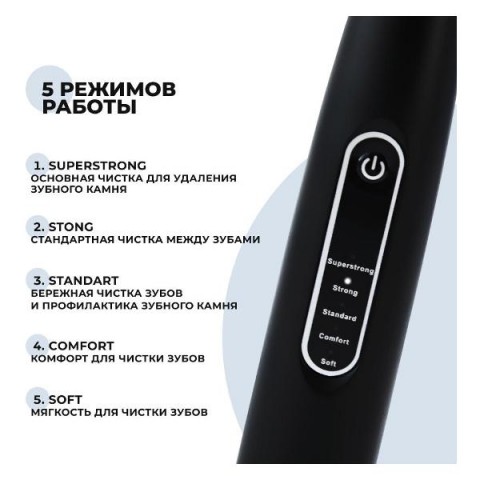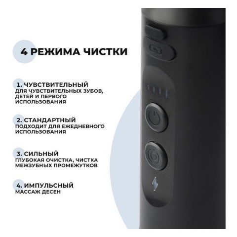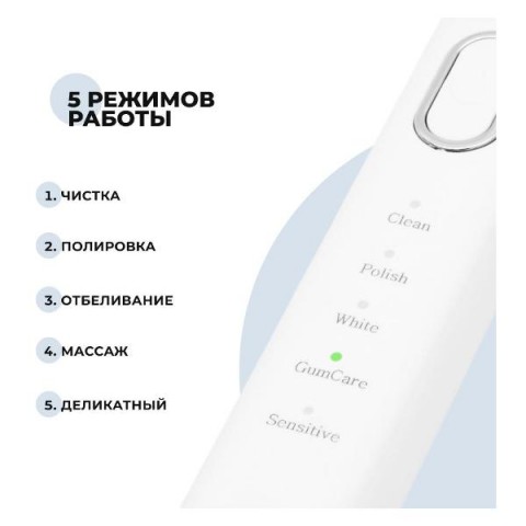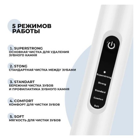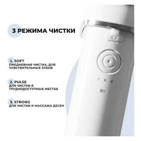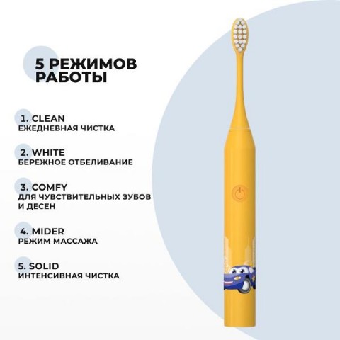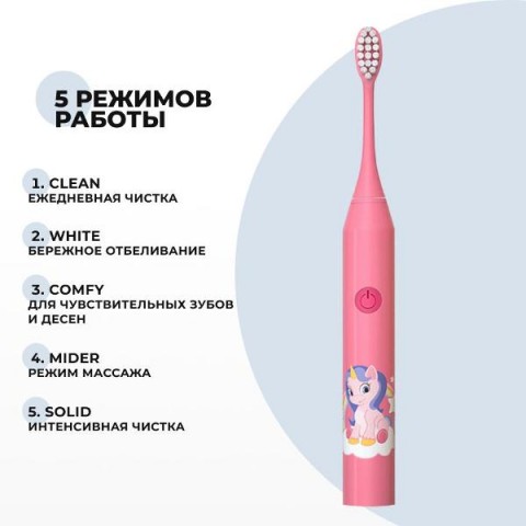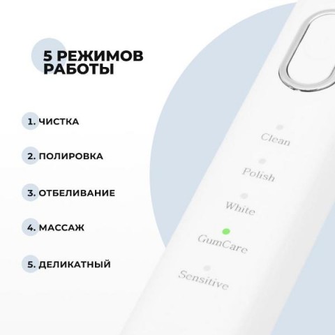 • Особенности:5 режимов работы, включение одной кнопкой, мягкие щетинки
